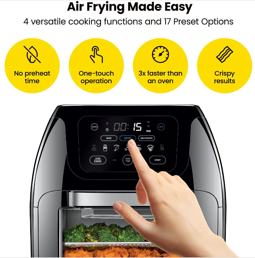 Monitor cooking progress: The interior lights and extra-large air fryer oven window allow you to check your food's cooking progress.
