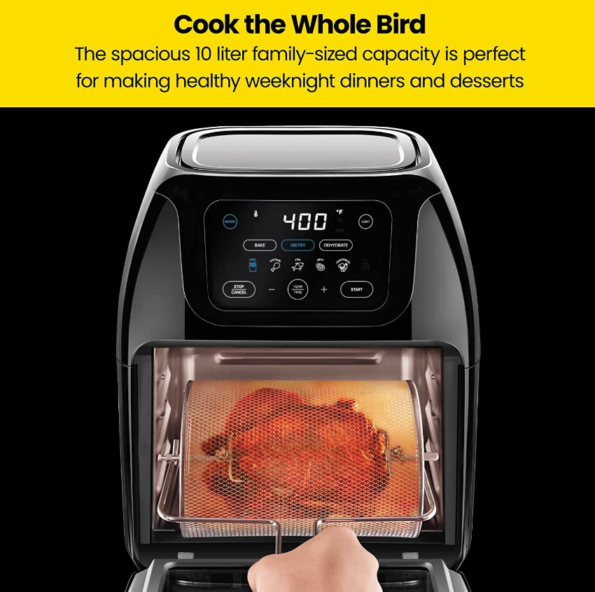 All-inclusive: Includes three air flow racks, stainless steel rotisserie oven spit and forks, stainless steel rotating basket/retrieval tool, and a drip tray.