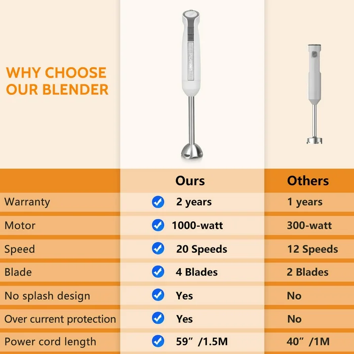 LINKChef Immersion Blender, 20-Speed 1000W 5-in-1 Immersion Hand Blender, Stick Blender with Turbo Mode, Baby Food Processor with Chopper, Blender for Kitchen with 600ml Beaker (White)