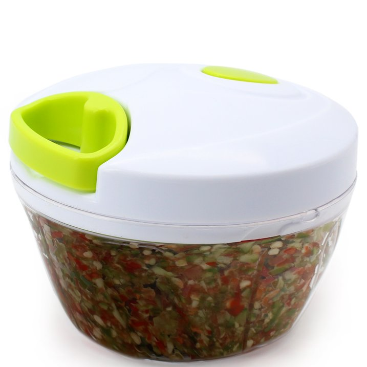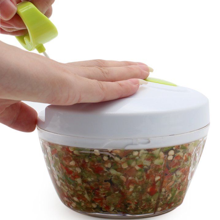 This manual food chopper takes the hard work out from chopping vegetables, fruits, nuts, and herbs. It is the perfect onion chopper that doesn't make your eyes watery. In just a few pulls, the blades begin to chop your ingredients, with no electricity required. NewThis versatile tool makes quick work out of tough cutting tasks, and it is easy to assemble, use and store. If you hate getting watery eyes when chopping onions, this will solve it all for you. With the lid on top and the onions kept inside of the bowl, you can effortlessly chop away without making,quick and easy way to chop fruits, vegetables, or create fresh salsas, pests, coleslaws, salads in just seconds.