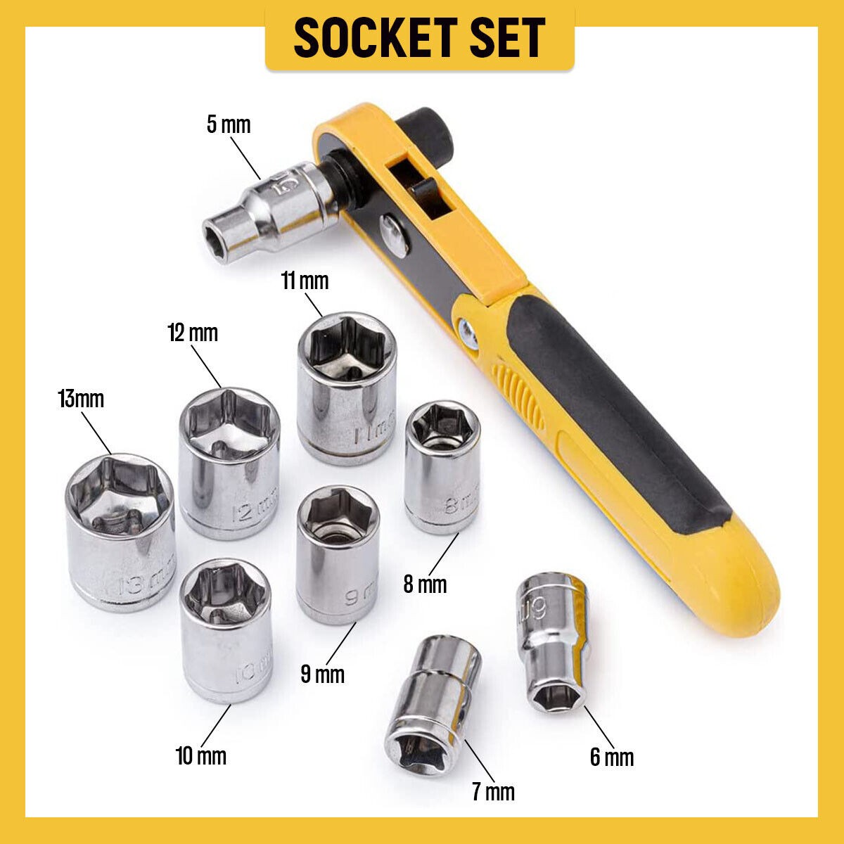 30pcs Bits., Metric socket., 1pc 8" adjustable wrench, Insulation tape, Mini retched wrench., 3m tape measure., Fastener parts., Plastic case, Bit holder., Hammer, Hex Key, Pliers, Screwdriver, Socket